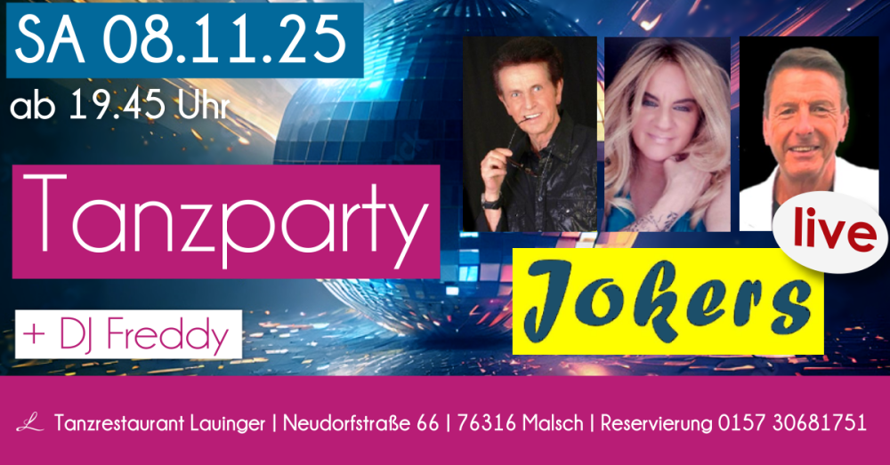 Am Samstag, 08.11.25 ab 19.45 Uhr sorgt die Tanz- und Partyband JOKERS für Stimmung im Lauinger und macht Lust auf Tanzen ! Gemeinsam mit DJ Freddy wird ein toller Tanzabend für Euch gestaltet.