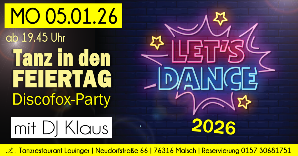 Ganz nach dem Motto "Let's dance" tanzen wir mit Euch am Montag, 05. Januar 2026 in den Feiertag. DJ Klaus wird Euch Tanz- und Partymusik vom Feinsten spielen und einen unvergeßlichen Tanzabend gestalten.